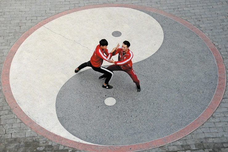 Двое практикующих тайцзицюань в Чэньцзягоу познают секреты мастерства на полу с узором инь-ян (уезд Вэньсянь, провинция Хэнань). Традиционная физическая практика тайцзицюань была внесена ЮНЕСКО в Репрезентативный список нематериального культурного наследия человечества в 2020 году.