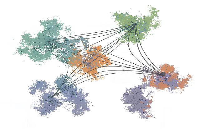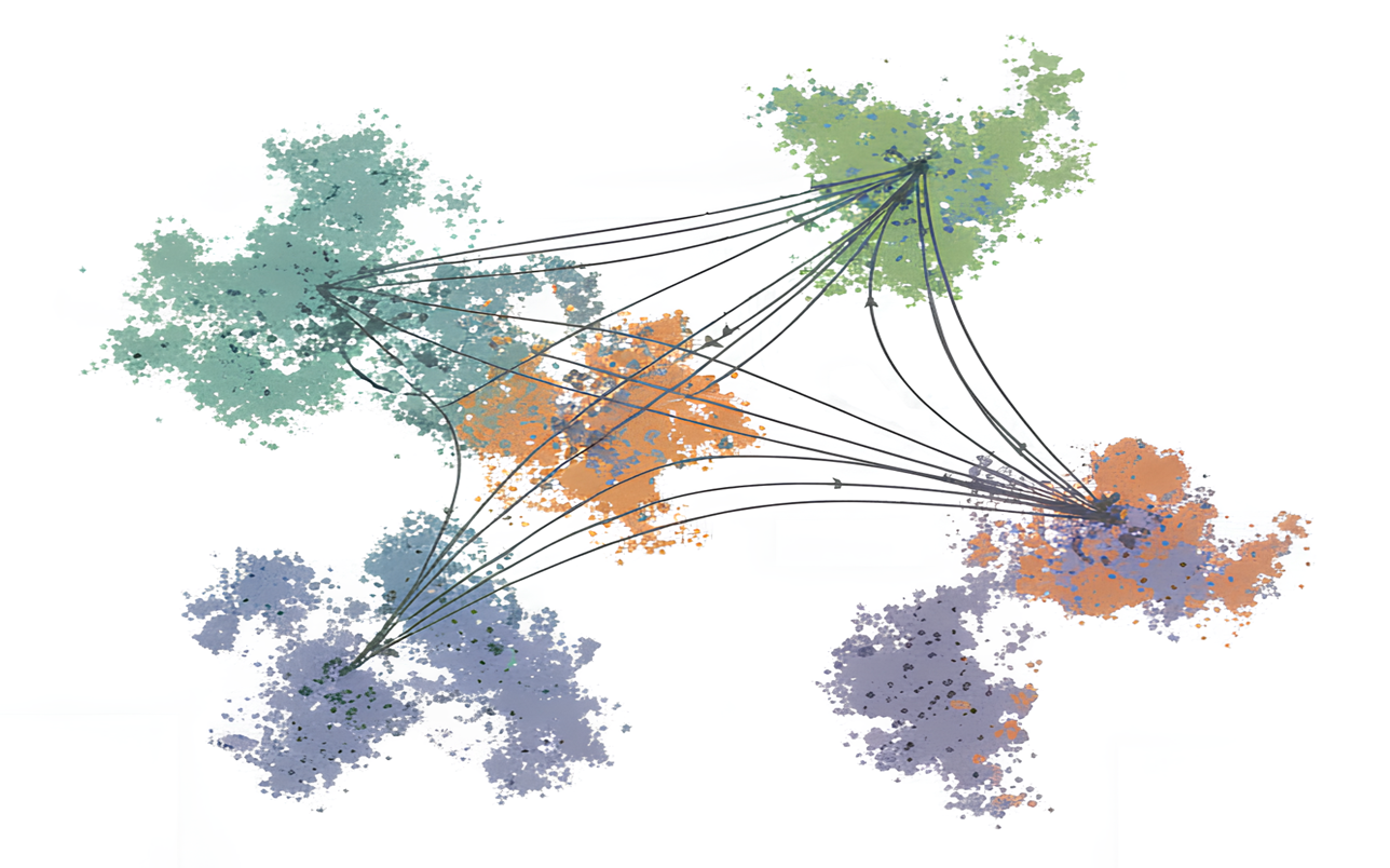 Чтобы понять, каким образом из вероятностных оценок языковой модели извлекается направление эволюционных изменений, необходимо кратко рассмотреть принцип работы метода evo-velocity. Он основан на сравнении условных вероятностей близких последовательностей, вычисляемых языковой моделью, и использовании этих локальных сравнений для построения ориентированного графа в латентном пространстве. Агрегация таких локальных направлений позволяет задать псевдовременную шкалу и выявить согласованные эволюционные потоки внутри белкового семейства (рис. 2).