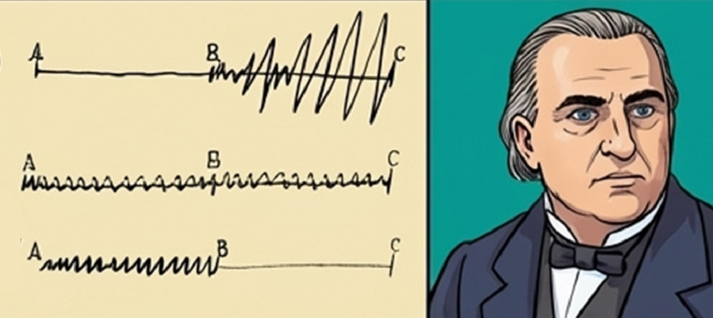 Рисунок 1. Джеймс Паркинсон (11.04.1755–1824) и Жан-Мартен Шарко (29.11.1825–16.08.1893). Изображение различных видов тремора, выполненное Шарко (1887). Отрезок AB обозначает состояние покоя, BC — состояние активности. Верхняя схема иллюстрирует тремор при рассеянном склерозе; средняя и нижняя — при болезни Паркинсона [5].
