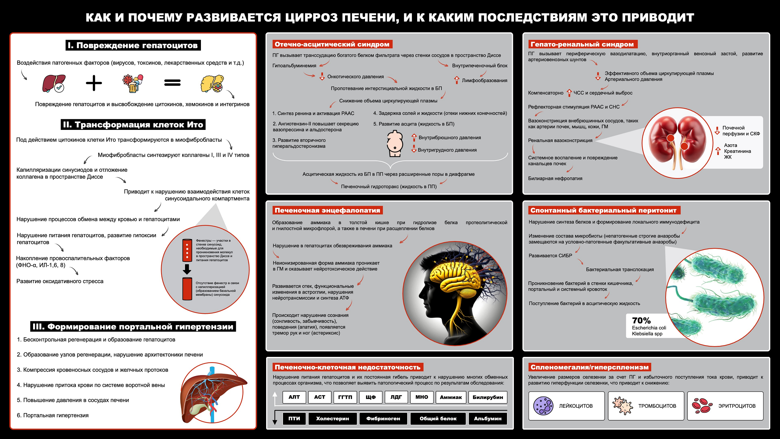 Постер на конкурс «Био/Мол/Текст»: При воздействии различных токсических факторов и нарушениях метаболизма происходит изменение клеточной структуры и, как следствие, архитектоники печени. Исходом этих процессов ставится цирроз печени. Нам предстоит выяснить, как и какие факторы могут привести к поражению клеток печени, как орган адаптируется и изменяется при постоянном воспалительном процессе и что происходит с организмом человека, когда компенсаторные функции печени исчерпаны.