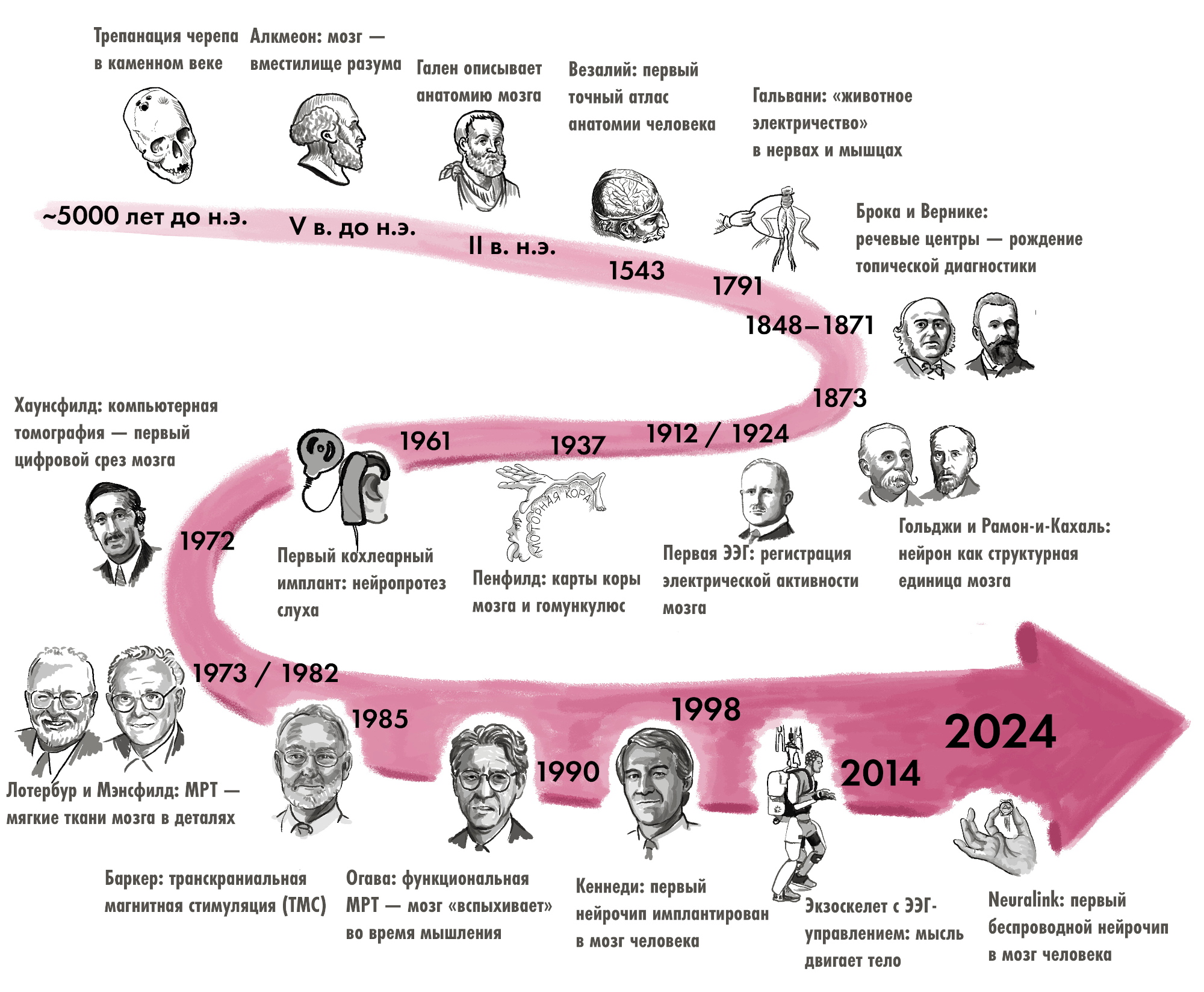 Рисунок 1. Основные вехи в долгой истории нейротехнологий. ~5000 лет до н.э.: Следы трепанации обнаружены на 10% черепов каменного века, преимущественно у взрослых мужчин. V в. до н.э.: Древнегреческий философ Алкмеон Кротонский первым выдвинул идею, что мозг — субстрат разума и ощущений. II в. н.э.: Римский врач Гален систематизировал знания об анатомии мозга, описав мозжечок, желудочки и черепно-мозговые нервы. 1543: Андреас Везалий опубликовал «De Humani Corporis Fabrica» — первый достоверный атлас анатомии человека, основанный на реальных вскрытиях. Раздел о мозге исправил множество ошибок Галена. 1791: Луиджи Гальвани в экспериментах с лягушачьими лапками доказал, что нервы и мышцы проводят электрический ток. Открытие «животного электричества» заложило основу всей нейрофизиологии. 1848–1871: В 1861 г. Поль Брока выявил моторный центр речи в левой лобной доле. В 1871 г. Карл Вернике описал сенсорный центр в левой височной доле. 1873: Камилло Гольджи открыл «черный метод» окраски нейронов нитратом серебра. Сантьяго Рамон-и-Кахаль доказал, что нейроны — отдельные клетки, а не единая сеть. 1895: Вильгельм Конрад Рентген открыл рентгеновское излучение. Уже через год врачи использовали рентгенографию черепа для диагностики переломов и инородных тел. 1912 / 1924: В 1912 г. советский физиолог В.В. Правдич-Неминский впервые зарегистрировал ЭЭГ с черепа собаки. В 1924–1929 гг. немецкий психиатр Ганс Бергер записал ЭЭГ человека, открыв эпоху функциональной диагностики мозга. 1927: Португальский невролог Антониу Эгаш Мониш разработал метод введения йодсодержащего контраста в мозговые сосуды (церебральная ангиография). 1937: Нейрохирург Уайлдер Пенфилд составил детальные карты функциональных зон коры и изобрел «гомункулюса» — модельного человечка, демонстрирующего непропорциональность функционального представительства частей тела в коре больших полушарий. 1948: Норберт Винер постулировал, что живой организм и машина используют одни принципы обратной связи и электрической передачи информации. Это концептуально открыло путь к нейроинтерфейсам. 1961: Уильям Хаус и Джон Дойл имплантировали первые электроды в улитку двух глухих пациентов. Это первый в истории нейропротез, восстанавливающий утраченное чувство через прямую электрическую стимуляцию нерва. 1972: Годфри Хаунсфилд и Аллан Кормак разработали компьютерный томограф. Началась эра нейровизуализации. 1973 / 1982: Пол Лотербур предложил использовать ЯМР для построения изображений (1973). Питер Мэнсфилд усовершенствовал алгоритмы. С 1982 г. начато коммерческое производство МР-томографов. 1985: Энтони Баркер с коллегами разработал метод транскраниальной магнитной стимуляции. 1990: Японский биофизик Сэйдзи Огава открыл принцип BOLD-контраста (зависимость МР-сигнала от насыщения гемоглобина кислородом). Это стало основой функциональной МРТ. 1998: Невролог Филипп Кеннеди имплантировал первый нейрочип в мозг парализованного пациента Джонни Рэя. Началась эра инвазивных нейроинтерфейсов «мозг–компьютер». 2014: На открытии ЧМ по футболу в Рио-де-Жанейро парализованный Джулиано Пинто ударил по мячу с помощью экзоскелета, управляемого ЭЭГ-сигналами с поверхности головы. 2024: В январе 2024 г. компания Neuralink Илона Маска имплантировала первый беспроводной нейрочип пациенту Ноланду Арбо. К 2026 г. чип использует 21 человек.