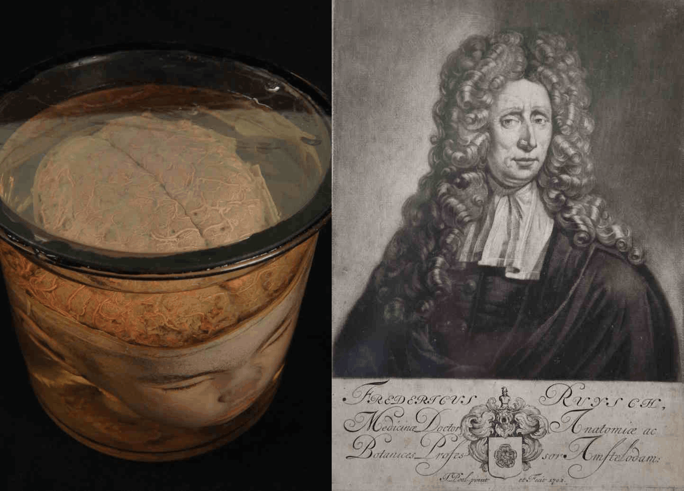 Рисунок 3. Препарат головного мозга (А), созданный голландским анатомом Фредериком Рюйшем (Б) и хранящийся в Кунсткамере. В 17 веке места, где проводились анатомические демонстрации, называли музеями, а препарирование человеческого тела считалось искусством. Ф. Рюйш одним из первых озаботился проблемой консервации мозговых тканей. Он делал инъекции смеси на основе сульфида ртути в мозговые сосуды, что и позволило коллекции Кунсткамеры сохраниться до настоящего времени.