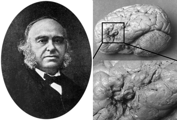 Накапливались случаи пациентов, благодаря которым анатомические атласы головного мозга дополнялись функциональными зонами (рис. 4А). В 1848 г. американский рабочий Финеас Гейдж попал в аварию на железной дороге — металлический лом пронзил его лобные доли; характер строителя из ответственного и добропорядочного превратился в импульсивный и неуправляемый (рис.4Б). Так врачи пришли к важному выводу, что лобные доли головного мозга отвечают за проявление воли, формирование нашего «Я», моральных качеств, принципов и убеждений [16], [17]. В 1861 году французский врач Поль Брока, исследуя мозг пациента по прозвищу «Тан-Тан» (способного произносить лишь этот слог), обнаружил повреждения в левой лобной доле, которую обозначил моторным центром речи [18]. А спустя 10 лет немецкий психиатр Карл Вернике описал обратный случай: пациент говорил бегло, но речь превращалась в бессмысленный поток слов — все дело было в повреждении сенсорного центра речи в левой височной доле. Ученые осознали: язык — это не единая «способность души», а система взаимосвязанных корковых зон и проводящих путей головного мозга [19] (рис. 4В) .