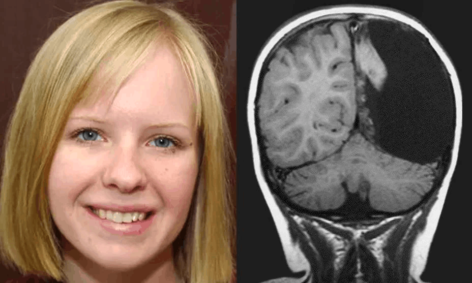 Рисунок 5. Головной мозг 7-летней девочки Кристины Сэнтхаус, которой удалили правое большое полушарие головного мозга из-за энцефалита Расмуссена — прогрессирующей воспалительной дегенерации головного мозга, сопровождающейся эпилептическими приступами (у Кристины было до 150 эпиприступов в день). После операции девочка могла говорить на двух языках и нормально передвигалась, в последствии получила высшее образование, создала семью и купила дом.