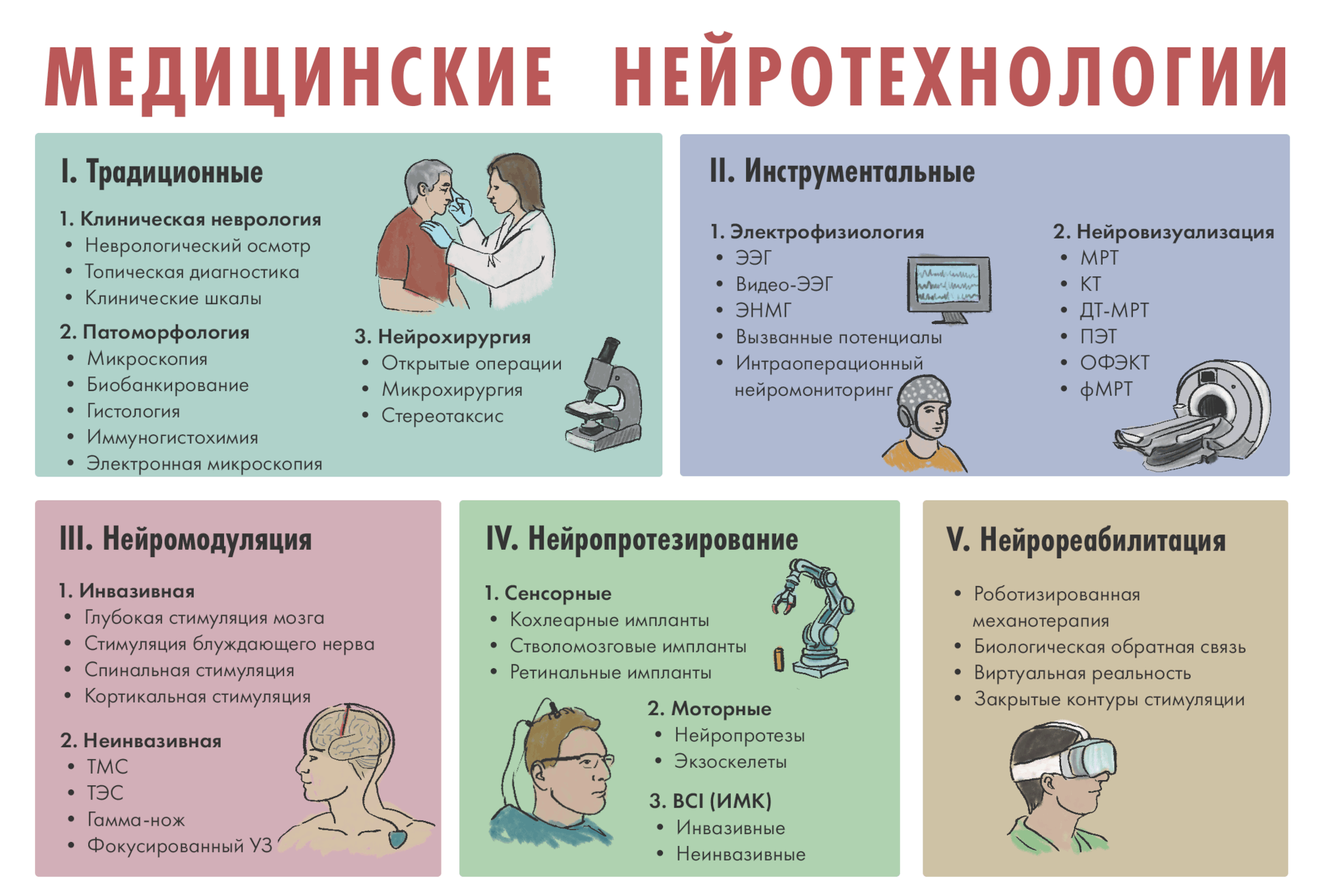 Рисунок 6. Все многообразие современных медицинских нейротехнологий можно разделить на диагностические и терапевтические. Традиционные подходы в неврологии и нейрохирургии не теряют актуальности — они не только заложили основы для развития других методов, но и стали основой грамотной маршрутизации пациента. Инструментальные методы повысили скорость и качество диагностики и лечения неврологических больных, сделали их более комфортными и персонализированными, т.е. учитывающими индивидуальные особенности строения нервной системы. Открылся доступ к наблюдению за живым мозгом в режиме реального времени — это стимулировало научное сообщество к разработке методов управляемого «вмешательства» в действующие нервные контуры. Так появились разнообразные методы нейромодуляцяции, нейропротезирования и нейрореабилитации. Потенциал многих из современных нейротехнологий еще только предстоит раскрыть в полной мере.