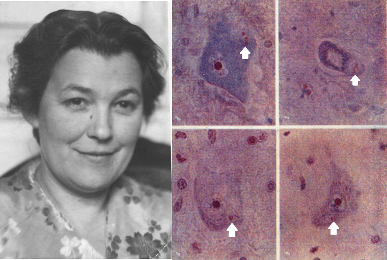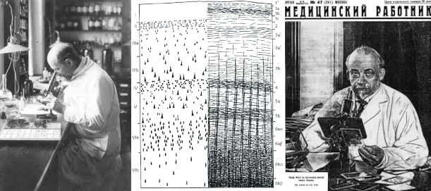 В СССР была сильная школа патоморфологии мозга — Татьяна Бунина из Института неврологии АМН СССР прославилась на весь мир, описав сложные молекулярные включения (тельца Буниной) в телах двигательных нейронов у пациентов с боковым амиотрофическим склерозом (рис. 7А) [28]. В этом же институте в послойных срезах были описаны характеристики мозговых сосудов разного калибра и их изменения при повышении артериального давления и атеросклерозе [29]. Микроскопия послойных тканевых срезов также повысила точность топической диагностики. Были описаны различия в строении слоев коры больших полушарий и мозжечка. Появились детальные карты «архитектуры» коры, основанные на гистологических различиях, такие как поля Бродмана и Фогта (рис. 7Б–В) [30].