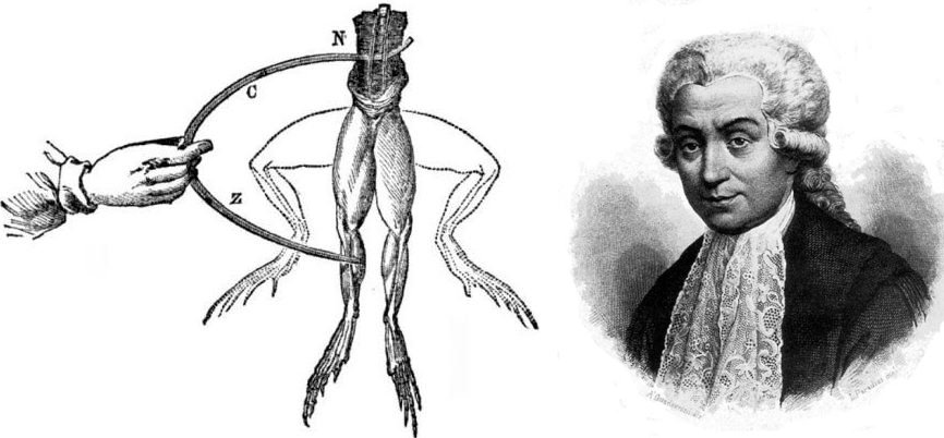 Еще со времен Галена ученые полагали, что мозг связан с телом и внешним миром с помощью чрезвычайно легкой жидкости — «психической пневмы». К началу XVIII века английские естествоиспытатели Исаак Ньютон и Стивен Гейлс предположили, что мозг «общается» с телом через «нити нервов» с помощью «энергии, действующей по поверхности, подобно электричеству». Началась массовая экспериментальная погоня за «животным электричеством» [36]. Открытия в этом направлении предвосхитил голландский биолог Ян Сваммердам: еще в 1664 году он препарировал бедренную мышцу лягушки, которая сокращалась при раздражении бедренного нерва (рис. 9А). В 1792 году Луиджи Гальвани в своем «Трактате о силах электричества при мышечном движении» обобщил известные на тот момент эксперименты с «оживлением» лапок мертвых лягушек при помощи тока [37]. Гальвани заключил, что нервы и мышцы способны проводить электричество (рис. 9Б).