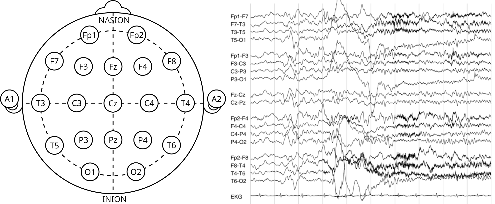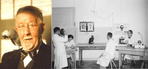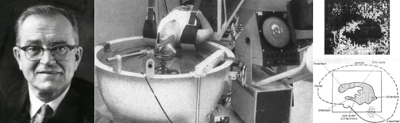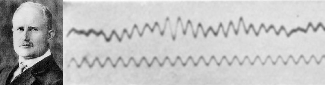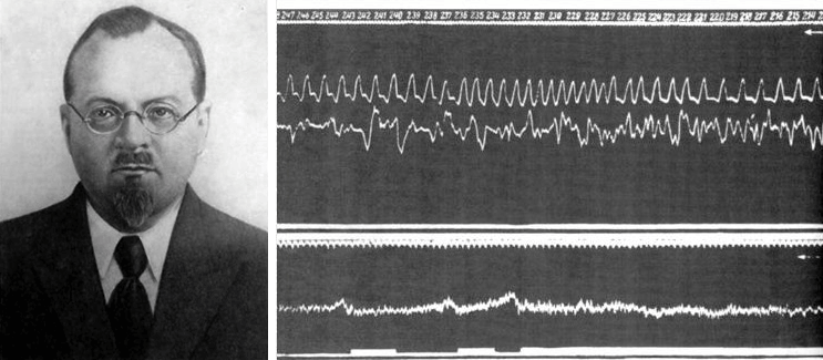 Научные изыскания на мозгах животных в конечном итоге привели к разработке универсального и безвредного способа регистрации суммарной электрической активности с поверхности черепа человека в режиме реального времени с помощью двух и более электродов. Сейчас этот метод известен как электроэнцефалография (ЭЭГ). Первая ЭЭГ была зарегистрирована с неповрежденного скальпа собаки в 1912 году «дедушкой ЭЭГ» — советским физиологом В.В. Правдич-Неминским (рис. 10А). А уже в 1929 году немецкий психиатр Ганс Бергер (которого называют «отцом ЭЭГ») опубликовал ЭЭГ-запись биоэлектрической активности с двух электродов, размещенных поверхности головы своего сына (рис. 10Б) [41].