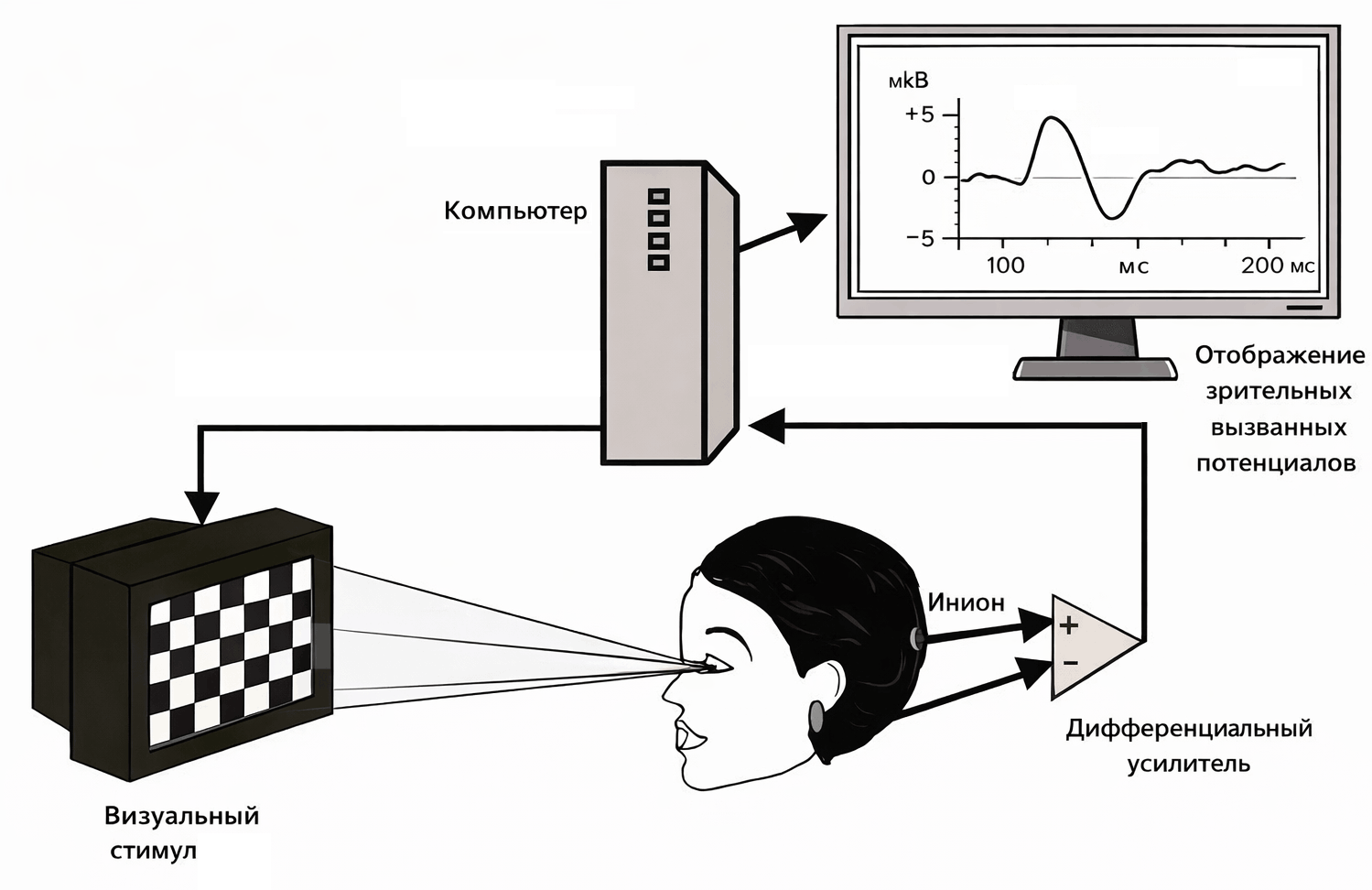 Разработка ЭЭГ-систем с множеством компактных электродов, а также математических алгоритмов обработки позволила вычленять из ЭЭГ-ритмов вызванные потенциалы — сверхслабые стереотипные ЭЭГ-изменения при воздействии раздражителей различной модальности или совершении действий. Рассчитываемый усредненный профиль вызванных потенциалов позволяет оценить работу зрительных, слуховых и двигательных нервных контуров по отдельности (рис. 10Д).
