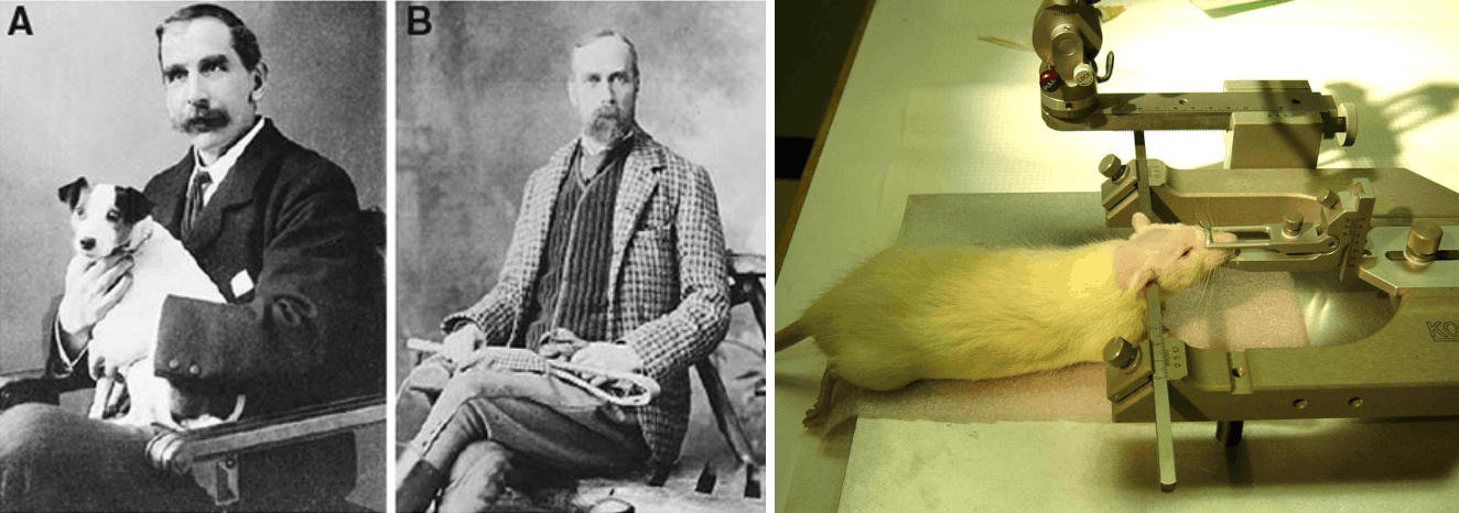 В 1849 году немецкий физиолог Эмиль Дюбуа-Реймон заложил основы электрофизиологии, зарегистрировав два основных «электрических состояния» нейрона — потенциал покоя [38] и потенциал действия (рис. 9В) [39], [40]. С тех пор ученые в Европе и России находились в активном поиске эффективных способов регистрации электрической активности головного и спинного мозга, а также периферических нервных волокон. Кролики, кошки, собаки и шимпанзе подвергались различным операциям по удалению частей мозга и вживлению электродов в мозговую ткань: поведенческая активность, рефлекторные и вегетативные реакции сопоставлялись с зарегистрированными электрическими импульсами.