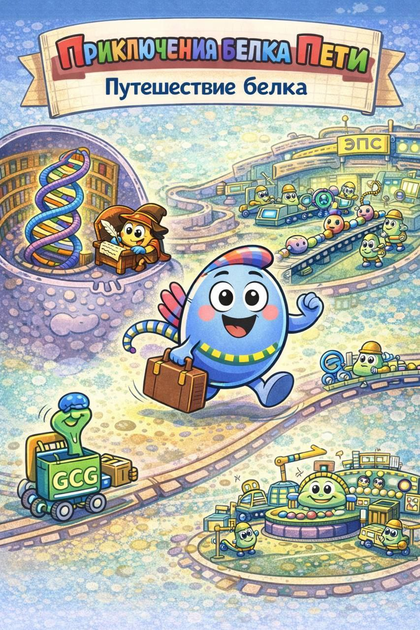 Комикс «Приключения белка Пети» — это наглядный рассказ о пути синтеза белка в эукариотической клетке, представленный в мультяшной форме.