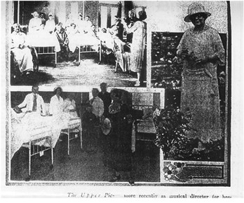 Рисунок 1. Реконструкция на основе фотографии выступления Изы Мод Ильсен (основательницы Национальной ассоциации музыки в больница) перед ранеными во время Первой мировой войны.