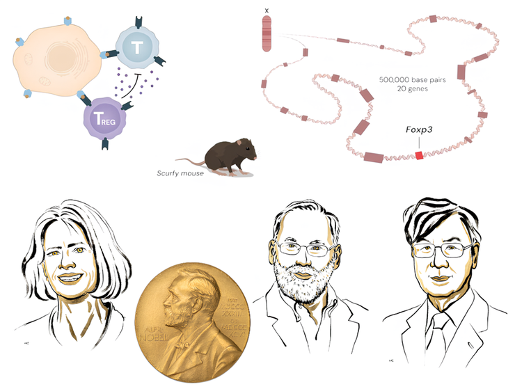 Мэри Бранкоу, Фред Рамсделл и Симон Сакагути — три лауреата Нобелевской премии по физиологии и медицине 2025 года. Премия присуждена «за открытия, касающиеся периферической иммунной толерантности». На рисунке также изображены основные вехи их открытий: мыши scurfy, которые помогли открыть ген Foxp3, необходимый для развития и функции регуляторных Т лимфоцитов; а также сами регуляторные Т-клетки (Тreg) в работе.